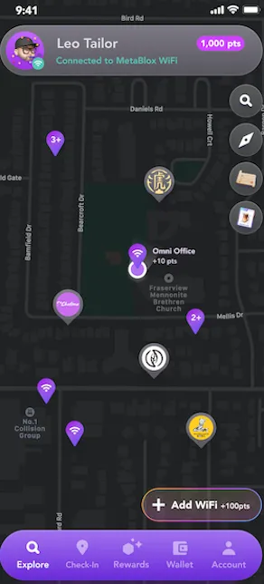 This mobile app rewards you for connecting to WiFi at a participating MetaBlox OpenRoaming hotspot.