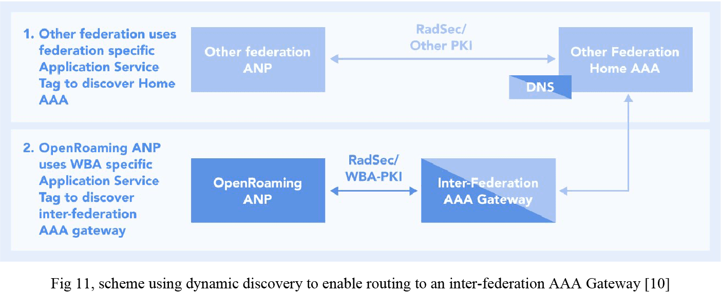 Other federations which want to interface with the OpenRoaming federation may use dynamic discovery with distinct NAPTR application service tags to facilitate integration. Specifically, eduroam plans to operate one central interchange point with OpenRoaming. By updating their DNS NAPTR records with the OpenRoaming defined service tags, an institution which is a member of the eduroam federation may permit its users to connect via an ANP supporting OpenRoaming.