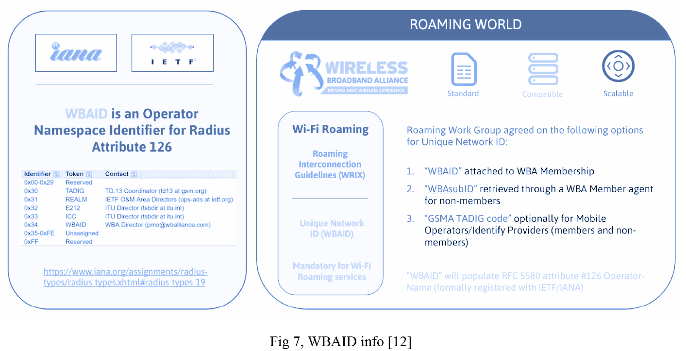 The WBAID consists of two parts, a mandatory “WBA Primary Member ID” which is assigned by the WBA when a company joins the WBA, and an optional prepended SubID that is allocated by a WBA Agent. WBAID is defined as follows: <Operator ID>:<country code>. It is included in the IDP and ANP identifiers in the usage exchange records as well as the financial information managed by the WRIX. Besides being used in the end to end communication and RADIUS attribute ‘Operator Name’, it is also used in the attribute ‘Chargeable User Identity’, combined with the user information and the WBAID Access-Accept in the Identity-Provider Vendor Specific Attribute. Other supporting processes, such as when requesting a PKI or during the exchange of configuration details, also require the WBAID.