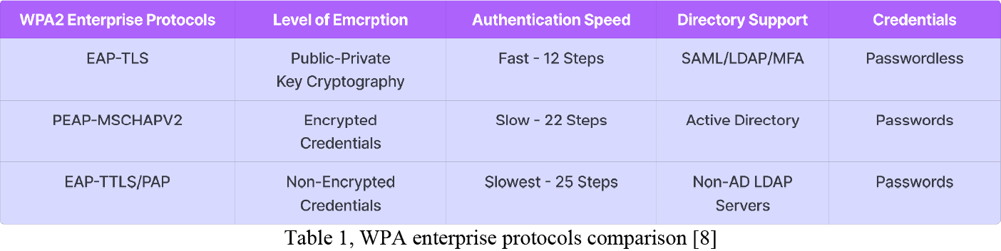 EAP is used on encrypted networks to provide a secure method of sending identifying information for the purpose of network authentication. EAP was developed by the IETF (Internet Engineering Task Force), and has been widely adopted by wired and wireless access networks. In enterprise WiFi, commonly used authentication methods implement EAP-TLS (Transport Layer Security), EAP-TTLS (Tunneled Transport Layer Security) and EAP-PEAP (Protected Transport Level Security).