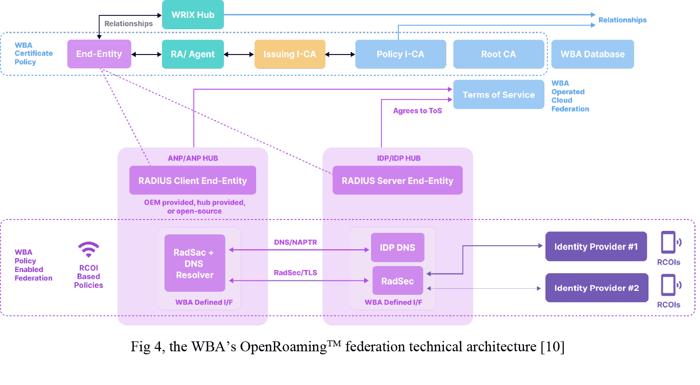 The diagram above describes the architectural framework for supporting the WBA’s Policy- Enabled WiFi Federation. Together the WBA’s Certificate Policy, Federation Terms of Service, and Database operations procedures define this federation’s operations.